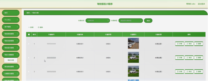 驾校车辆管理,在驾校车辆管理页面可以对索引、车辆编号、车辆名称、车辆类型、车辆图片、车辆位置等内容进行详情,修改或删除等操作。