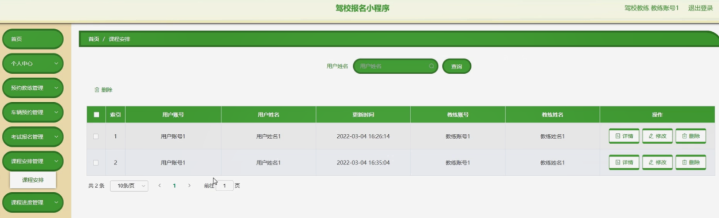 课程安排管理,在课程安排管理页面可以对索引、用户账号、用户姓名、更新时间、教练账号、教练姓名等内容进行详情、修改或删除等操作。