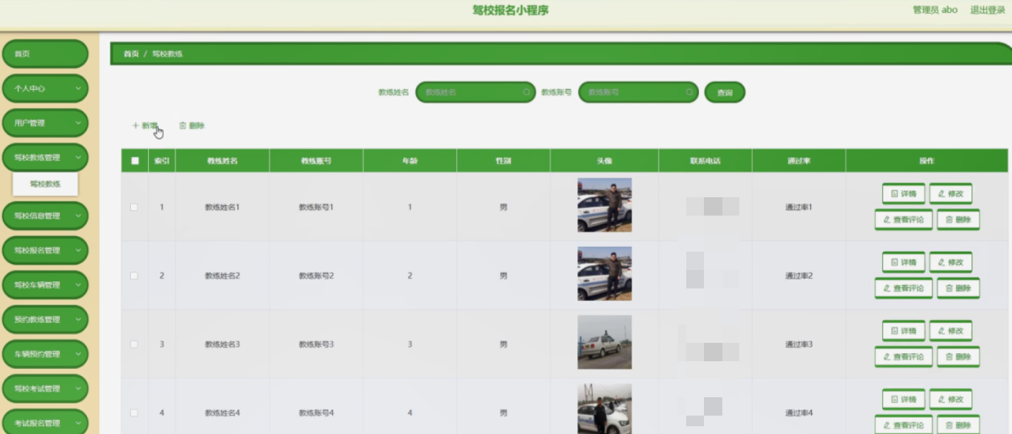 驾校教练管理,在驾校教练管理页面可以对索引、教练姓名、教练账号、年龄、性别、头像、联系电话、通过率等内容进行详情,修改,查看评论和删除操作。