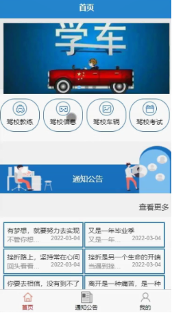 用户登陆后进入小程序首页,可以实现首页、通知公告、我的等,在我的页面可以对驾校报名、预约教练、车辆预约、考试报名、课程安排、课程进度、在线咨询等功能进行详细操作。