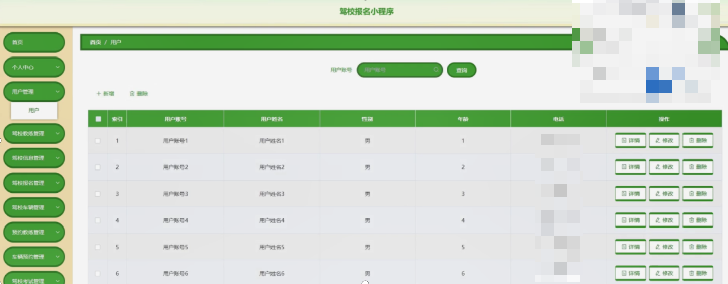用户管理,在用户管理页面可以对索引、用户账号、用户姓名、性别、年龄等内容进行详情、修改或删除等操作。