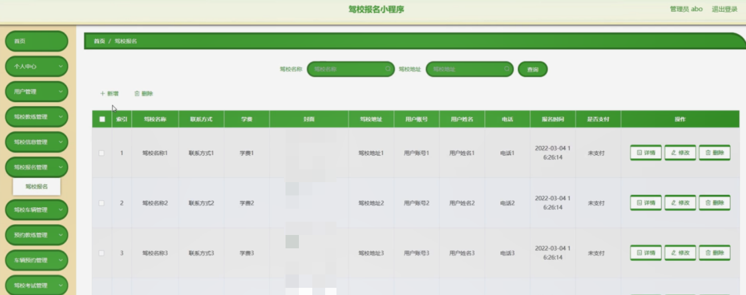 驾校报名管理,在驾校报名管理页面可以对索引、驾校名称、联系方式、学费、封面、驾校地址、用户账号、用户姓名、电话、报名时间、是否支付等内容进行详情,修改和删除等操作。
