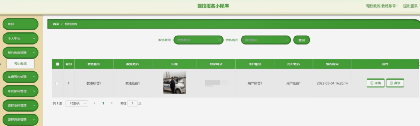预约教练管理,在预约教练管理页面可以对索引、教练账号、教练姓名、头像、联系电话、用户账号、用户姓名、预约时间等内容进行详情和课表操作。