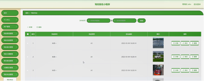 驾校考试管理,在驾校考试管理页面可以对索引、考试科目、考试类型、发布时间、图片等内容进行详情、修改或删除等操作。