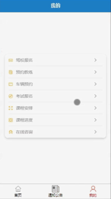用户,在我的页面可以对驾校报名、预约教练、车辆预约、考试报名、课程安排、课程进度、在线咨询等详细信息进行操作。