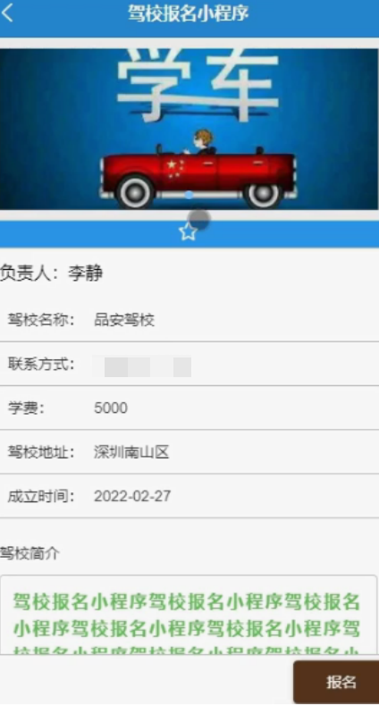 驾校信息,在驾校信息页面可以查看负责人、驾校名称、联系方式、学费、驾校地址、图片、成立时间、驾校简介等信息,并根据需要进行报名,评论和收藏等操作。