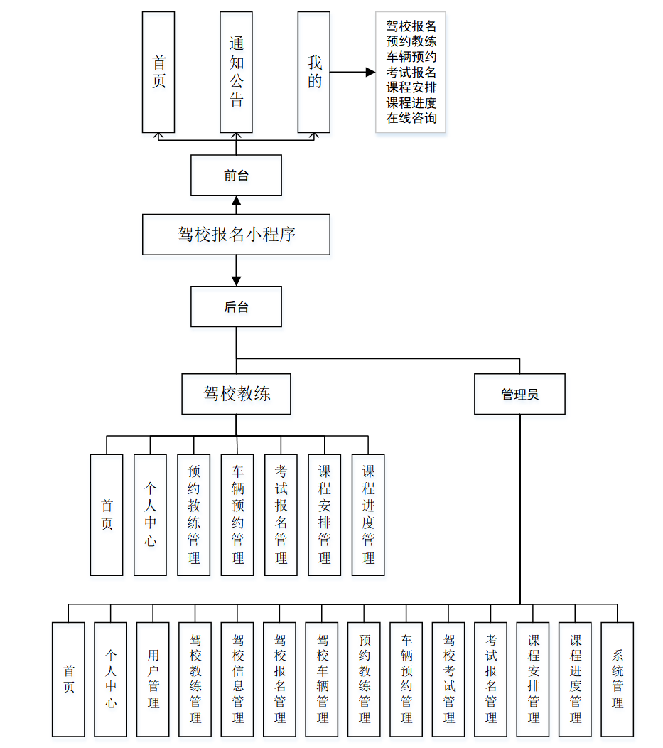 驾校教练主要包括首页、个人中心、预约教练管理、车辆预约管理、考试报名管理、课程安排管理、课程进度管理等功能。