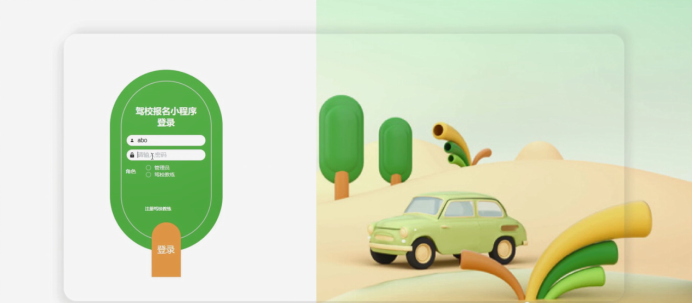 后台登录,管理员和驾校教练通过输入账号、密码,选择角色并点击登录进行系统登录操作。