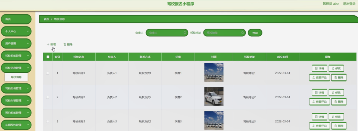 驾校信息管理,在驾校信息管理页面可以对索引、驾校名称、负责人、联系方式、学费、封面、驾校地址、成立时间等内容进行详情,修改,查看评论和删除操作。