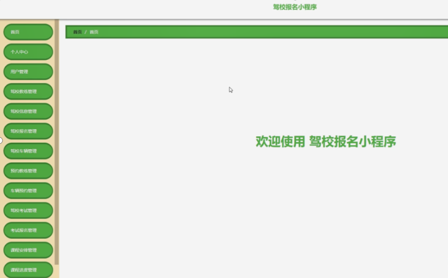 管理员登陆后,主要包括首页、个人中心、用户管理、驾校教练管理、驾校信息管理、驾校报名管理、驾校车辆管理、预约教练管理、车辆预约管理、驾校考试管理、考试报名管理、课程安排管理、课程进度管理、系统管理等功能。