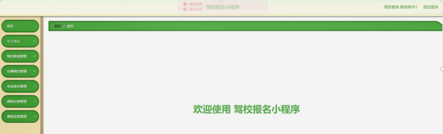 驾校教练登陆系统后,可以对首页、个人中心、预约教练管理、车辆预约管理、考试报名管理、课程安排管理、课程进度管理等功能进行相应操作。