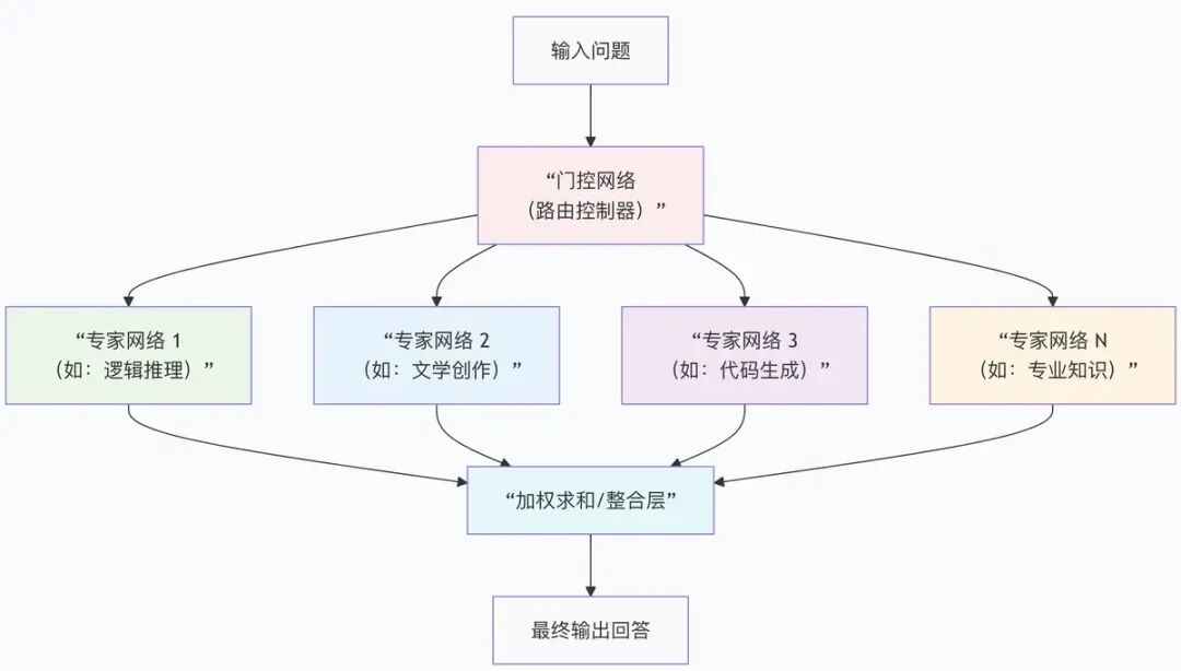 核心思路:类似医院的专科医生,大模型被分成多个"专家子网络",每个子网络专注处理某一类任务(如逻辑推理、文学创作、专业知识问答)。