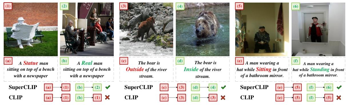 图1:评估图像-文本检索中的细粒度对齐。每一行都呈现了视觉和语义上非常相似的成对图像和说明文字,但在细粒度的语义区分上有所不同,例如对象状态(例如雕像与真实)、空间关系(例如外部与内部)和动作(例如坐与站)。虽然图像和文本在意义上很接近,但SuperCLIP在正确区分这些细粒度语义区别方面表现出比CLIP更强的能力。附录A.1提供了其他示例。