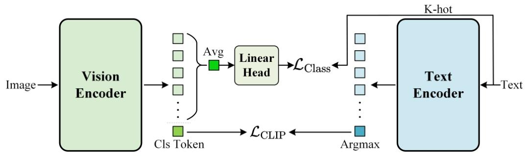 在CLIP的视觉编码器后添加轻量级线性层,引入基于分类的监督信号,直接利用原始文本token引导视觉编码器关注文本中的语义实体及其视觉表现,在仅增加0.077%计算量(FLOPs)且无需额外标注数据的前提下,增强细粒度视觉-文本对齐。