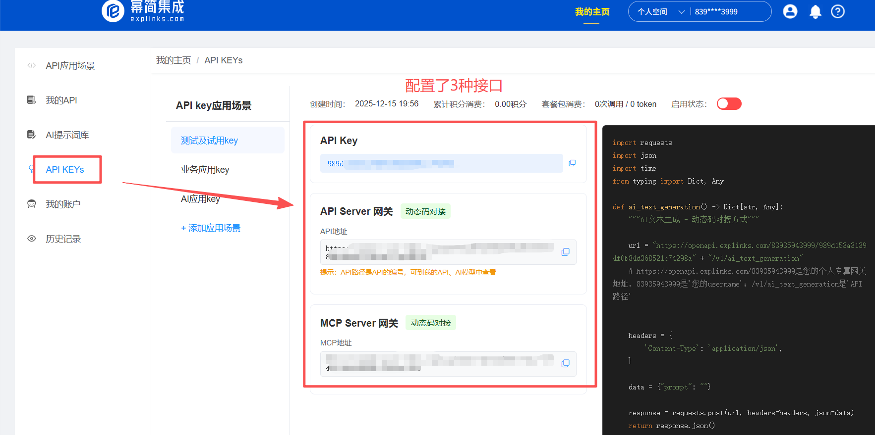 集成了3种场景的APIkey,每个场景配置了3个接口。