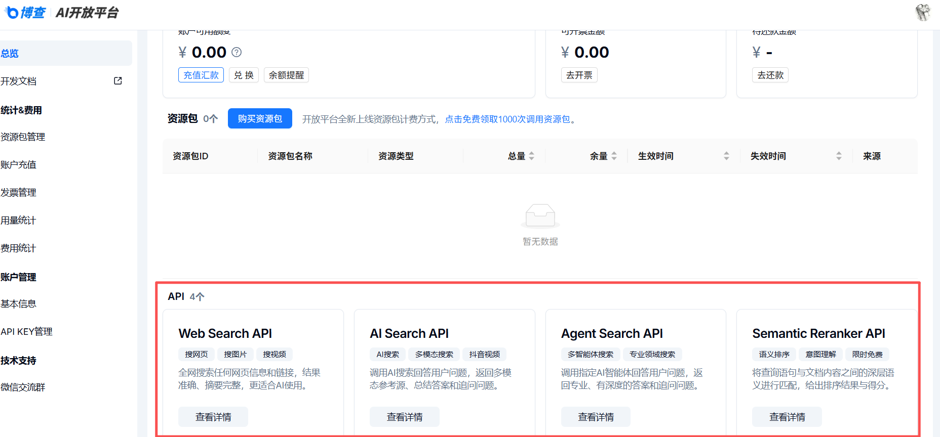 国内备案产品,数据不出海符合合规要求,微信扫码登录open.bochaai.com就能创建API Key。提供Web、AI、Agent、三款搜索API,支持设置搜索时间范围和长文本摘要输出,适配AI应用和RAG开发,还给出了Python、curl等调用示例代码,采用阶梯收费,充值越多可用次数和并发量越高。