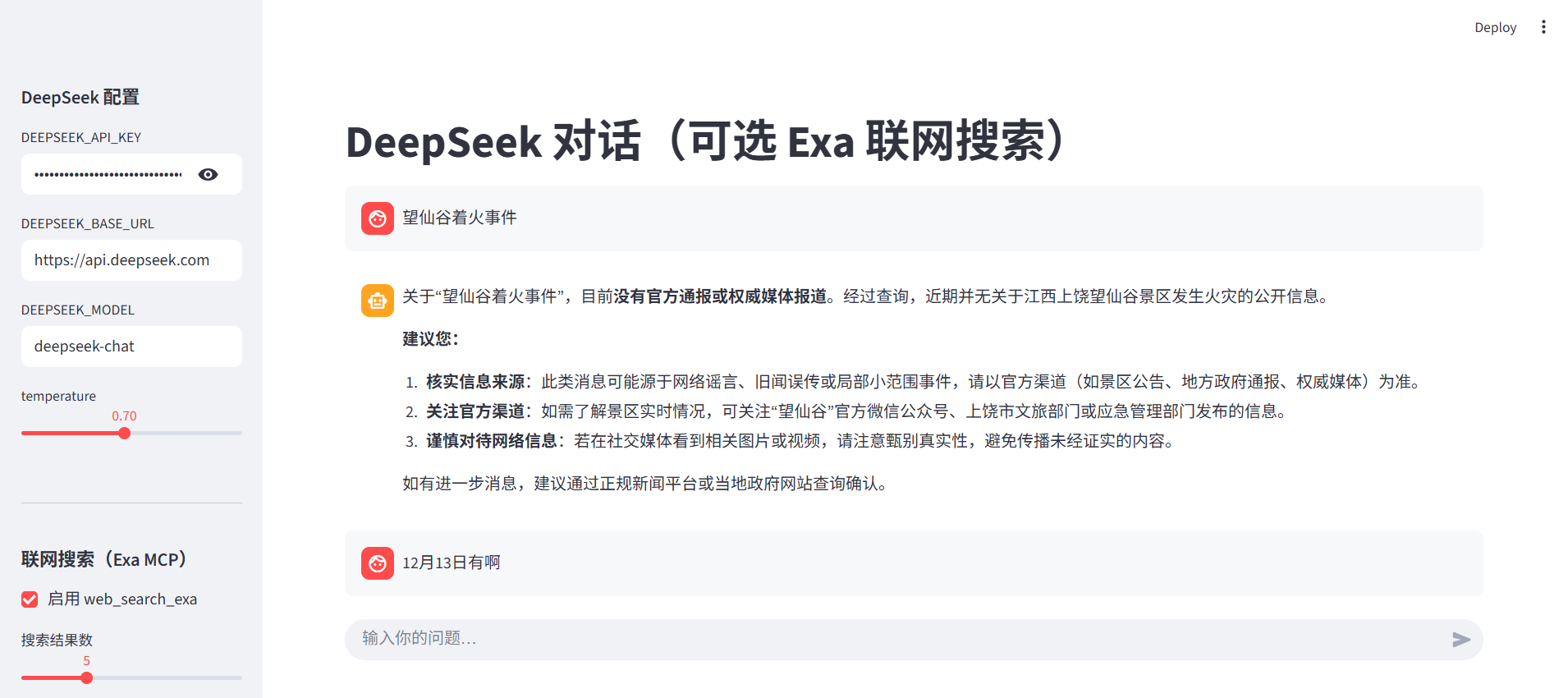 st.title("DeepSeek 对话(可选 Exa 联网搜索)")