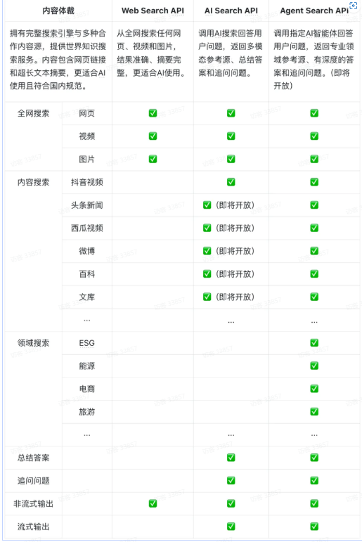 -- 为你的AI应用提供多模态参考源、总结答案和追问问题,在全网搜索的基础上,提供抖音视频、头条新闻、西瓜视频、微博、百科等内容源,并且提供AI总结的答案与追问问题;