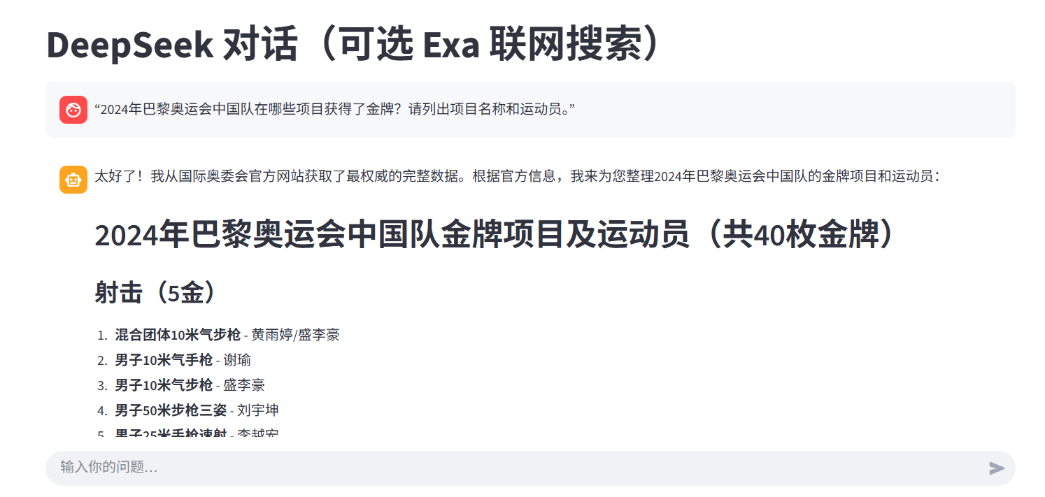 "2024年巴黎奥运会中国队在哪些项目获得了金牌?请列出项目名称和运动员。"这个测试的是它对近期新闻和体育赛事结果的综合检索与概括能力。