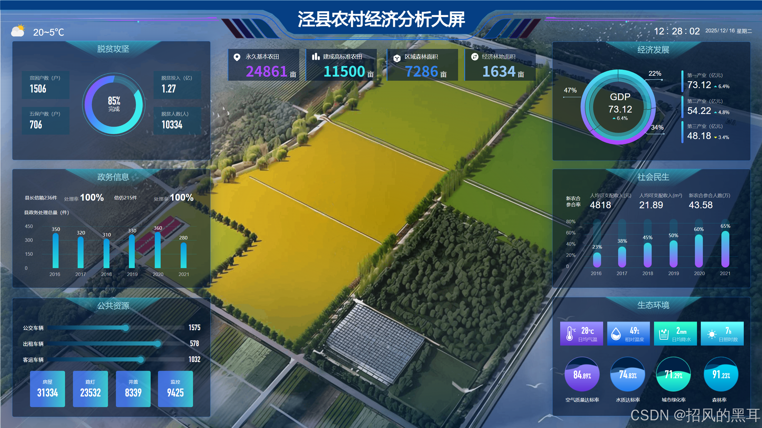 位于大屏的左上角,显示当前的温度和天气状况。这一模块的设计简洁明了,用户可以一目了然地获取基本信息,对于农村经济中与农业生产相关的决策有一定的参考价值。 - 脱贫攻坚模块