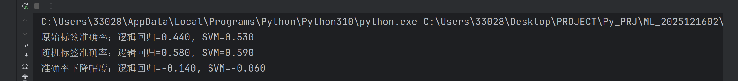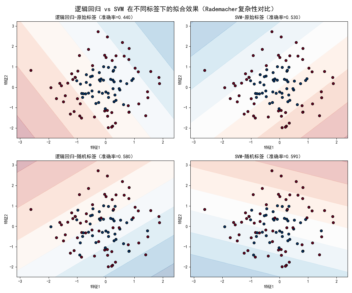 rademacher_complexity_comparison.png中,逻辑回归在随机标签下仍试图拟合噪声(决策边界相对规则),而SVM的决策边界更混乱,直观印证了理论结论。