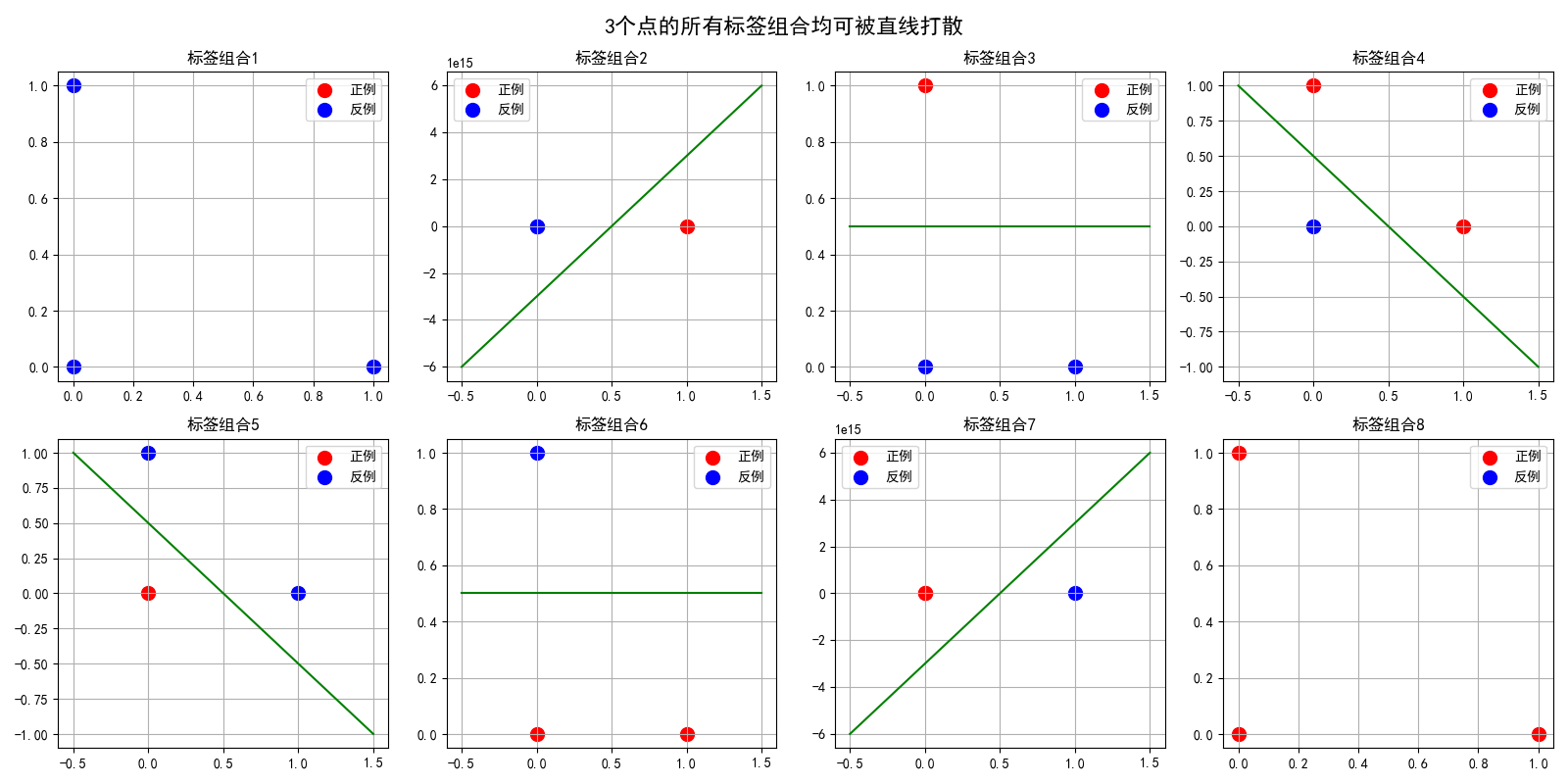 这段代码演示了机器学习中VC维(Vapnik-Chervonenkis dimension)的核心概念------"打散(shattering)"。VC维是衡量一个假设类(如线性分类器)表示能力的数学工具,决定了模型的复杂度和泛化能力。