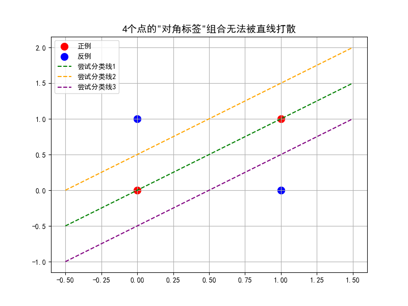 运行上述代码后,会生成两张图片:第一张3_points_shattering.png展示3个点的8种标签组合都能找到绿色分类线完美分离;第二张4_points_not_shattering.png中,无论绘制哪条直线(绿色、橙色、紫色虚线),都无法同时将红色对角点(正例)和蓝色对角点(反例)分开。这就直观证明了直线分类器的VC维是3。