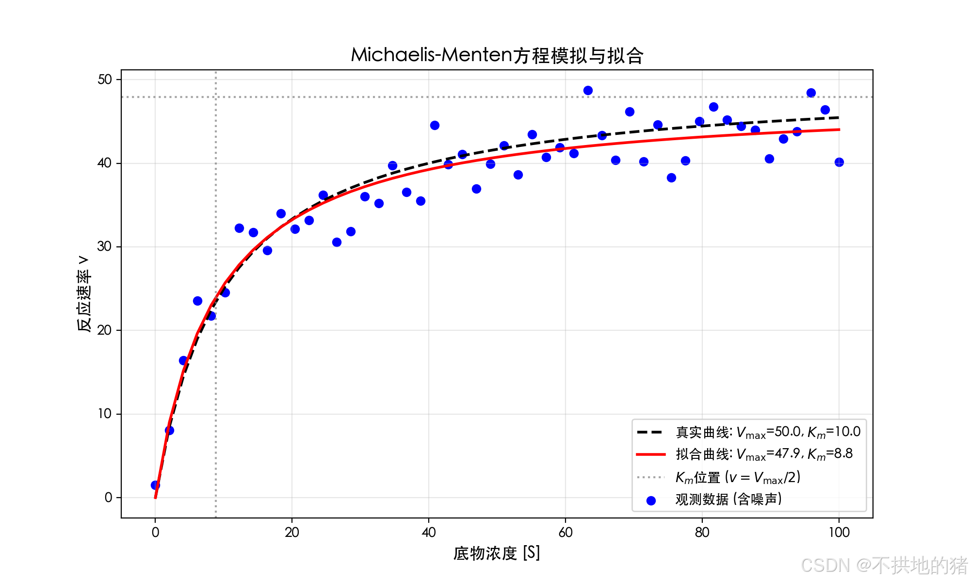 Vmax_true, Km_true = 50.0, 10.0 # 真实参数
