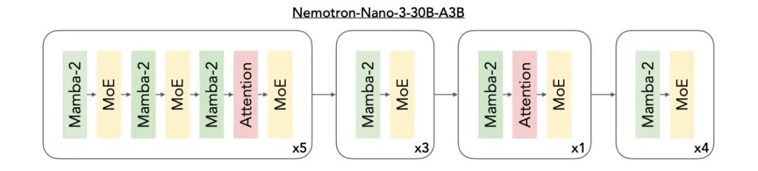 Nemotron 3 将三种架构整合进同一个主干网络中: