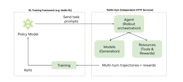 Diagram illustrating interaction between an RL Training Framework on the left and NeMo Gym on the right. The training framework sends task prompts to the agent server in the NeMo Gym. The agent server coordinates with the policy model server and external resources server to collect rollouts and verify task performance. The scored trajectories are returned back to the Training Framework for model updates.
