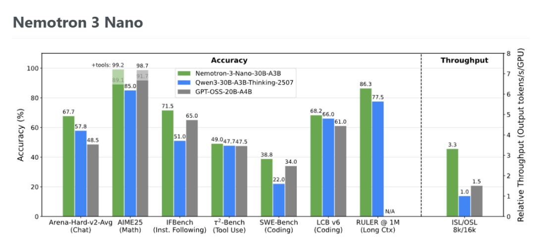 - 在单张 H200、8K 输入 / 16K 输出的配置下,Nemotron 3 Nano 的推理吞吐量分别比 Qwen3-30B-A3B 高 3.3 倍 ,比 GPT-OSS-20B 高 2.2 倍。