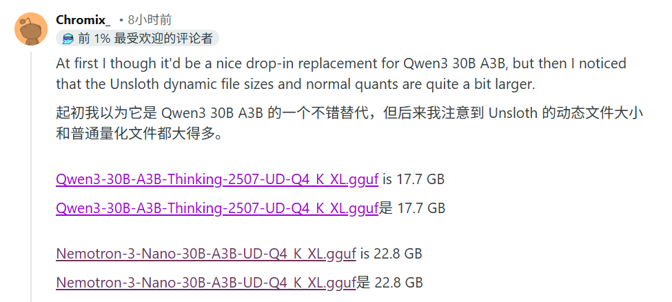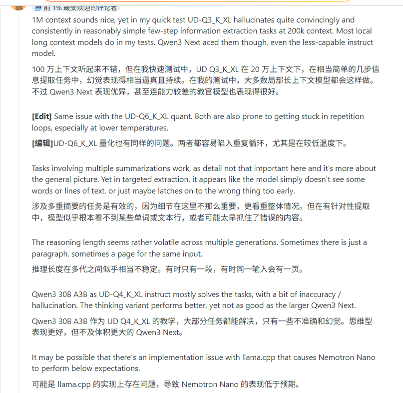 还有网友发现,Nemotron 3 Nano 在长上下文和信息提取任务中仍存在幻觉、重复和推理不稳定的问题,而 Qwen3 系列在类似任务上表现更稳健,这可能是因为是llama.cpp对模型的发挥存在限制。