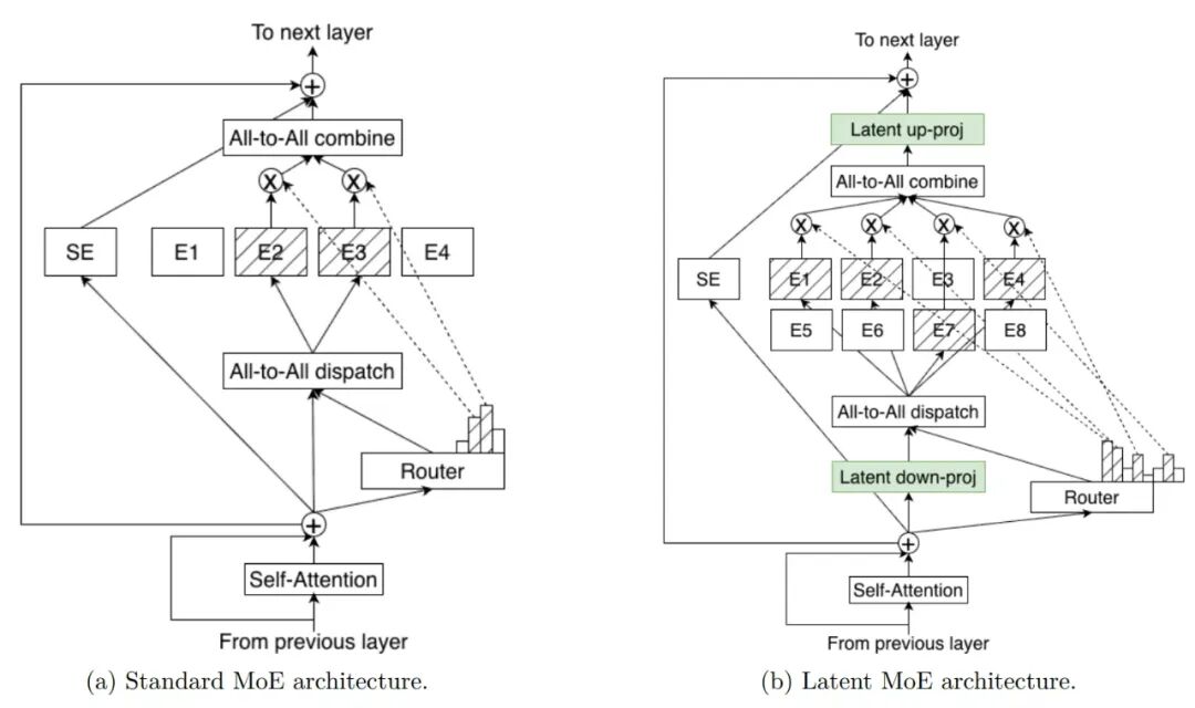 Nemotron 3 Super 和 Ultra 在实现更先进的精度和推理性能的同时,也引入了一项突破性创新:latent MoE(潜在空间专家混合) 。