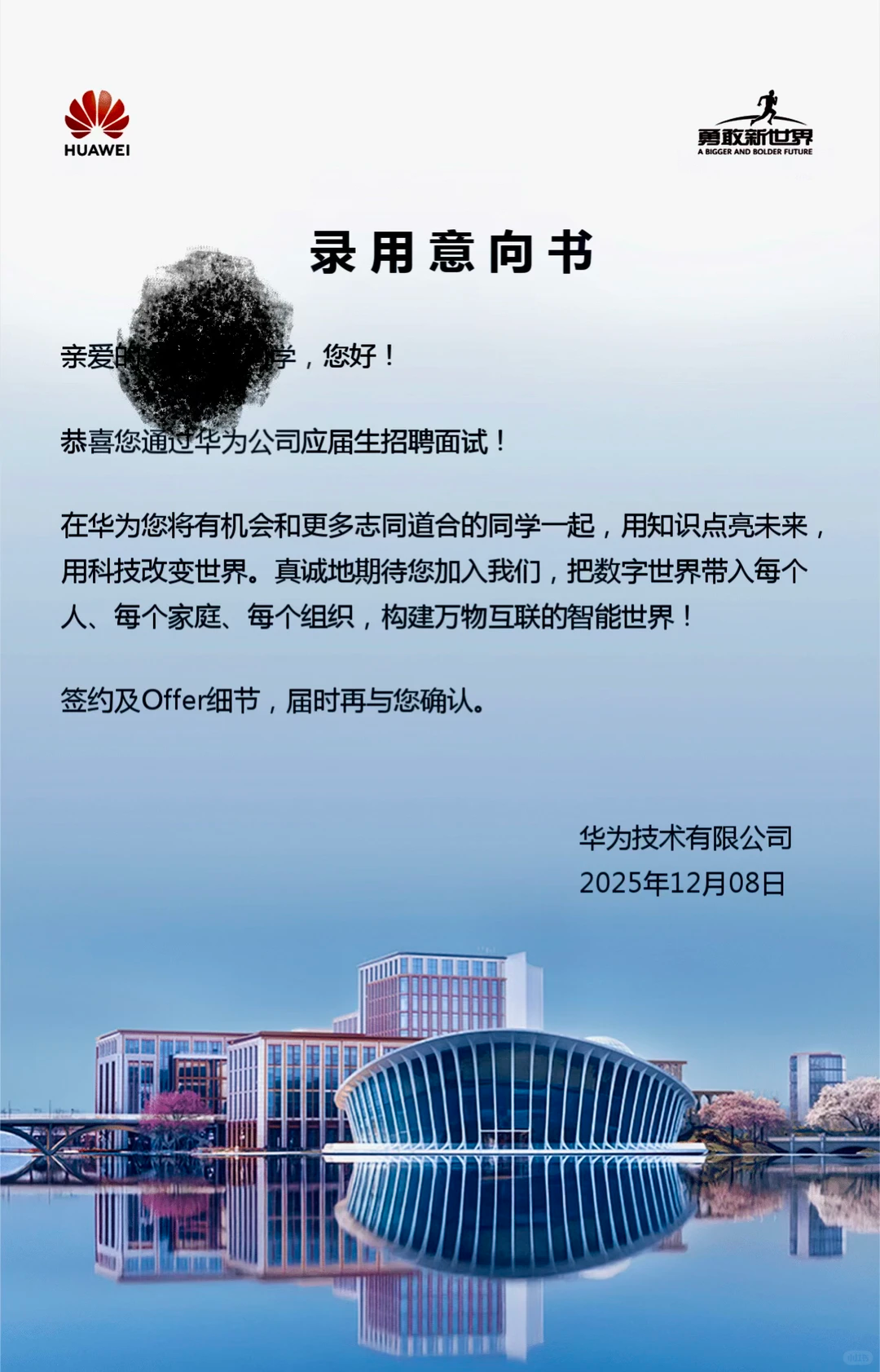 华为的秋招流程还是比较长的,有看到同学 8 月初投递的简历,12 月初收到确认意向电话,到 8 号才终于收到意向书。