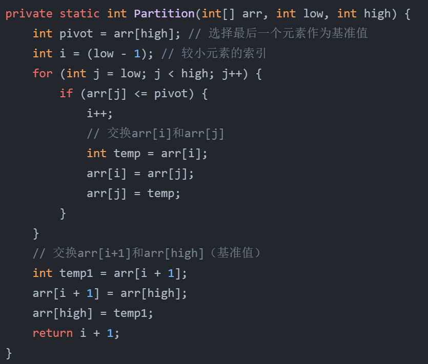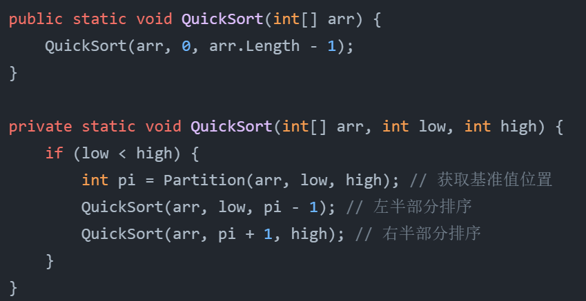 通过一趟排序将数组分为两部分,左部分小于基准值,右部分大于基准值,递归地对两部分进行排序。
