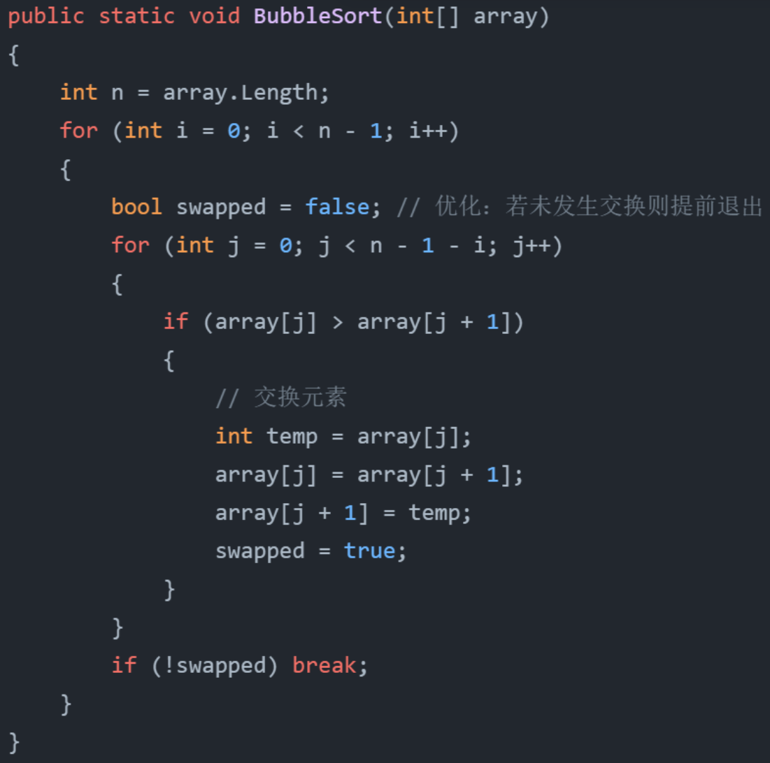 swapped标志可避免不必要的循环,提升效率。 - 数组越界 :内循环条件需为 j < n - 1 - i,避免访问 array[j+1] 时越界。