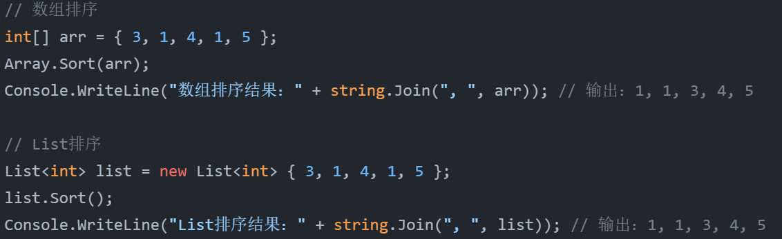 Console.WriteLine("排序后数组:" + string.Join(", ", arr)); // 输出:1, 1, 3, 4, 5