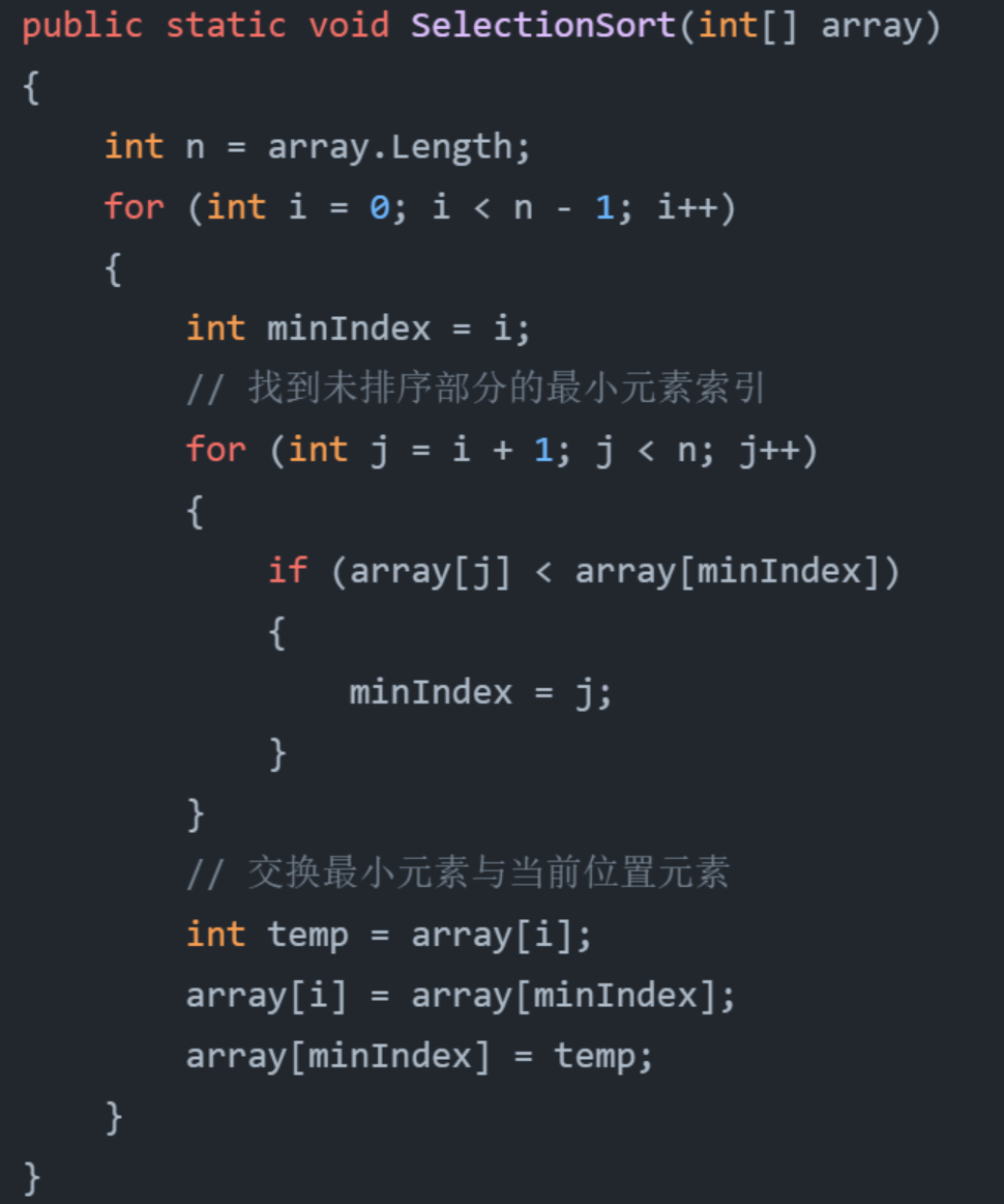 选择排序通过每次从未排序部分选择最小(或最大)元素,将其放到已排序部分的末尾。重复此过程直到整个数组有序。