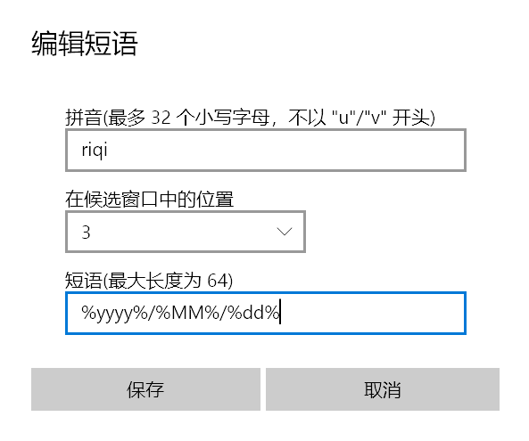 我们可以在微软输入法中的 设置 > 词库和自学习 > 用户自定义短语 > 添加或编辑自定义短语 的设置中,去管理自定义短语,并使用特殊占位符去设置为动态的短语。