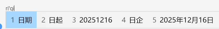 比如,我们希望输入 riqi 的时候,能够打出形如 2025年12月16日 这样的今日日期的候选词,那么我们可以设置为 %yyyy%/%MM%/%dd%: