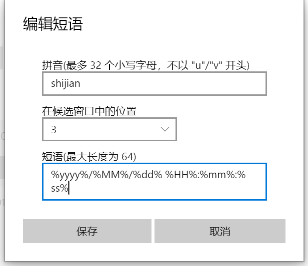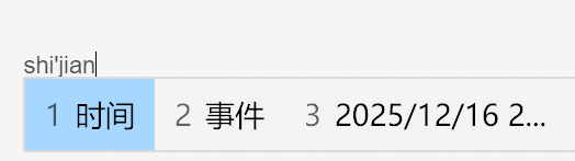 又比如,我想打 shijian 的时候,出现形如 2025/12/16 20:06:12 当前时间的候选词,那么我们可以设置为 %yyyy%/%MM%/%dd% %HH%:%mm%:%ss%