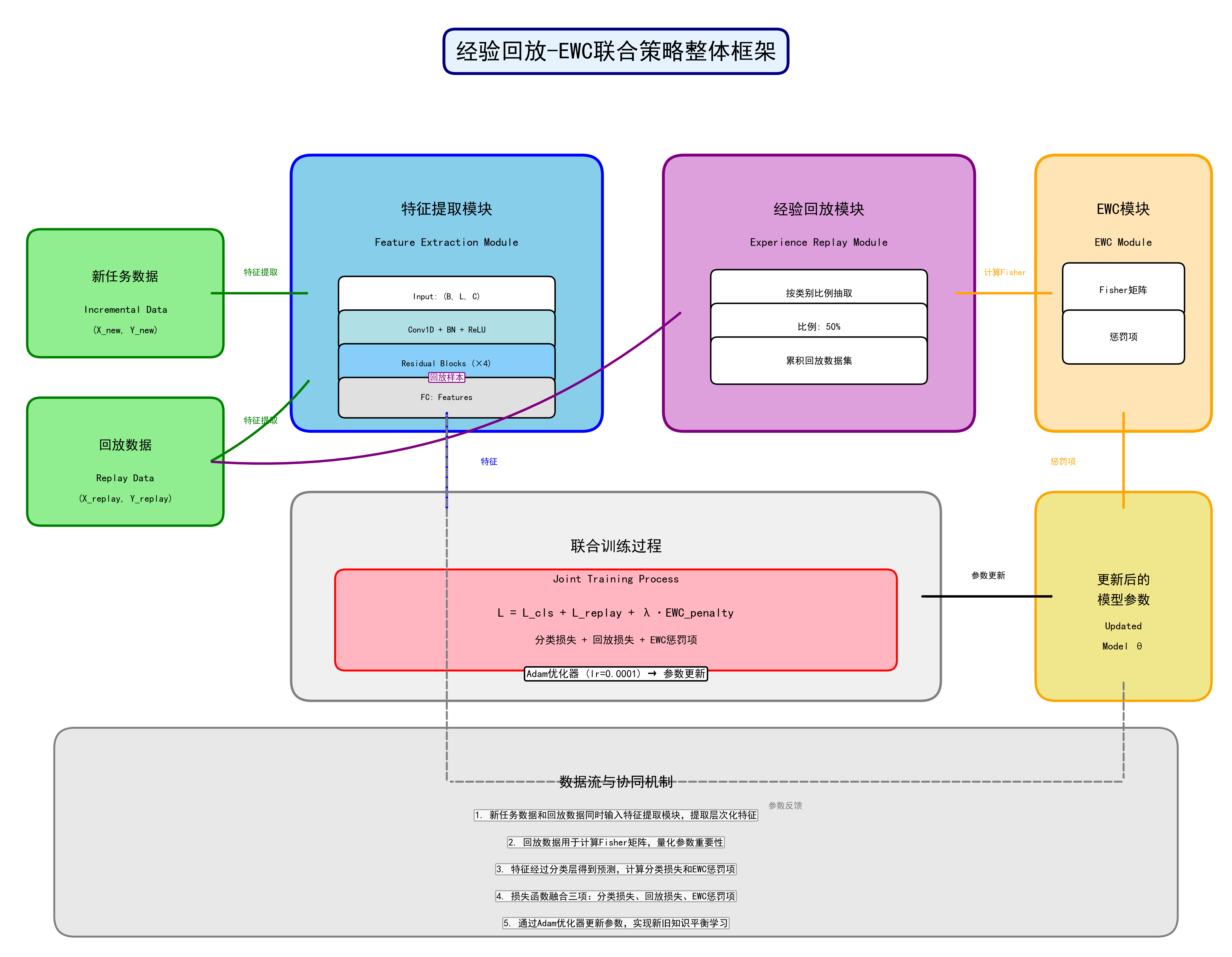 本文提出的解决方案:基于经验回放(Experience Replay)+ 弹性权重巩固(Elastic Weight Consolidation, EWC)的联合策略,让AI系统像人类一样,在学习新知识的同时不忘旧知识。