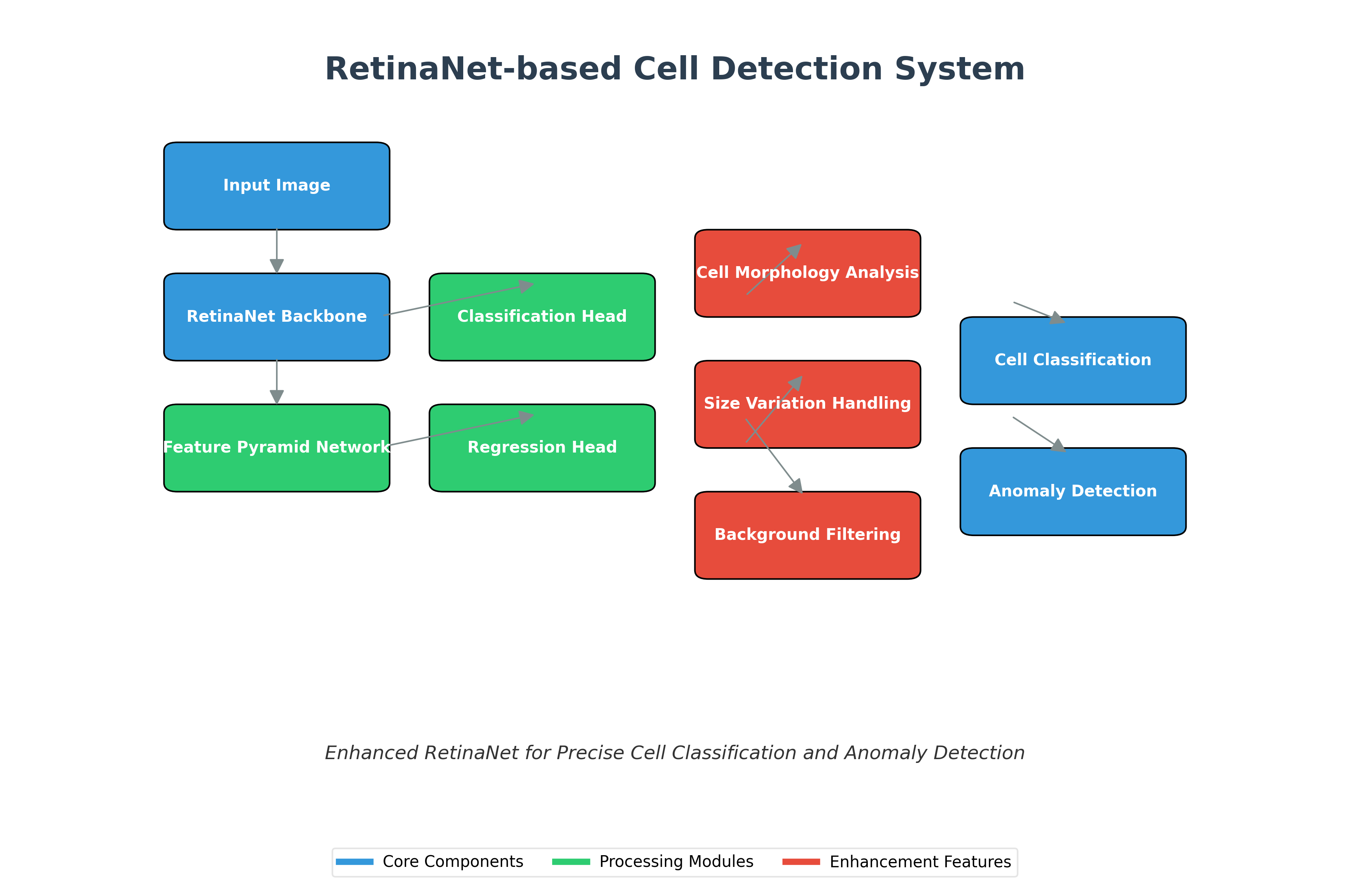 针对体液细胞检测的特殊性,我们对标准RetinaNet进行了多项改进。首先,我们采用了更深的骨干网络(如ResNet-101)来提取更丰富的特征表示,这对于显微镜图像中细微结构的识别至关重要。其次,我们在特征金字塔网络中引入了额外的特征融合层,增强了不同尺度特征的交互,提高了对小细胞的检测能力。
