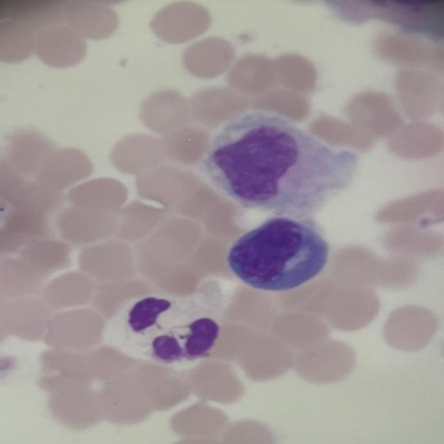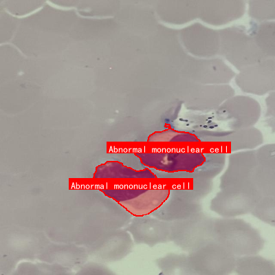 如图所示,这是一张包含异常单核细胞的显微镜图像,红色标注框标记了两个异常单核细胞。从图中可以看出,异常细胞在形态上与正常细胞有显著差异:下方细胞体积较大,胞质丰富且着色偏深红,细胞核形态不规则,呈现多叶或扭曲状;上方细胞相对较小,胞质颜色较浅,细胞核结构模糊但存在明显异型性。这些异常特征对于疾病的早期诊断具有重要意义,而改进的RetinaNet模型通过注意力机制和多任务学习框架,能够有效捕捉这些细微的形态学变化。