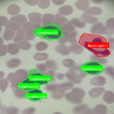 如图所示,这是显微镜下血液涂片的图像,标记了淋巴细胞(绿色框)和中性粒细胞(红色框)。从图中可以看出,淋巴细胞体积较小,胞质少且淡染,细胞核大而圆;中性粒细胞体积较大,胞质丰富,细胞核分叶明显。这种细胞形态的多样性对检测模型提出了挑战,而RetinaNet结合FPN的多尺度特征提取能力恰好能够应对这一问题。