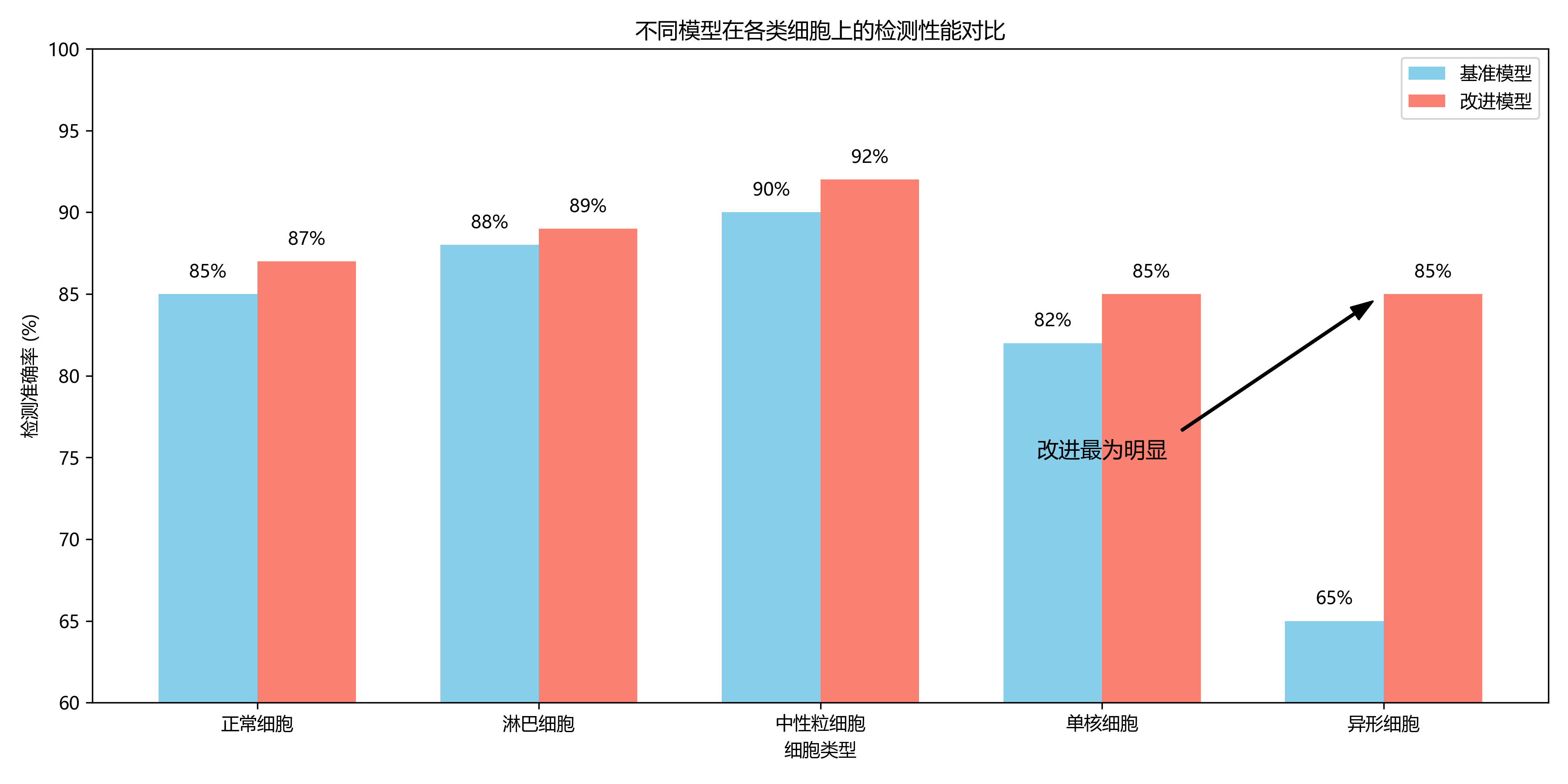 上图展示了不同模型在各类细胞上的检测性能对比。可以看出,改进后的模型在稀有细胞类型(如异形细胞)上的检测效果提升最为明显,这得益于我们引入的注意力机制和Focal Loss设计。