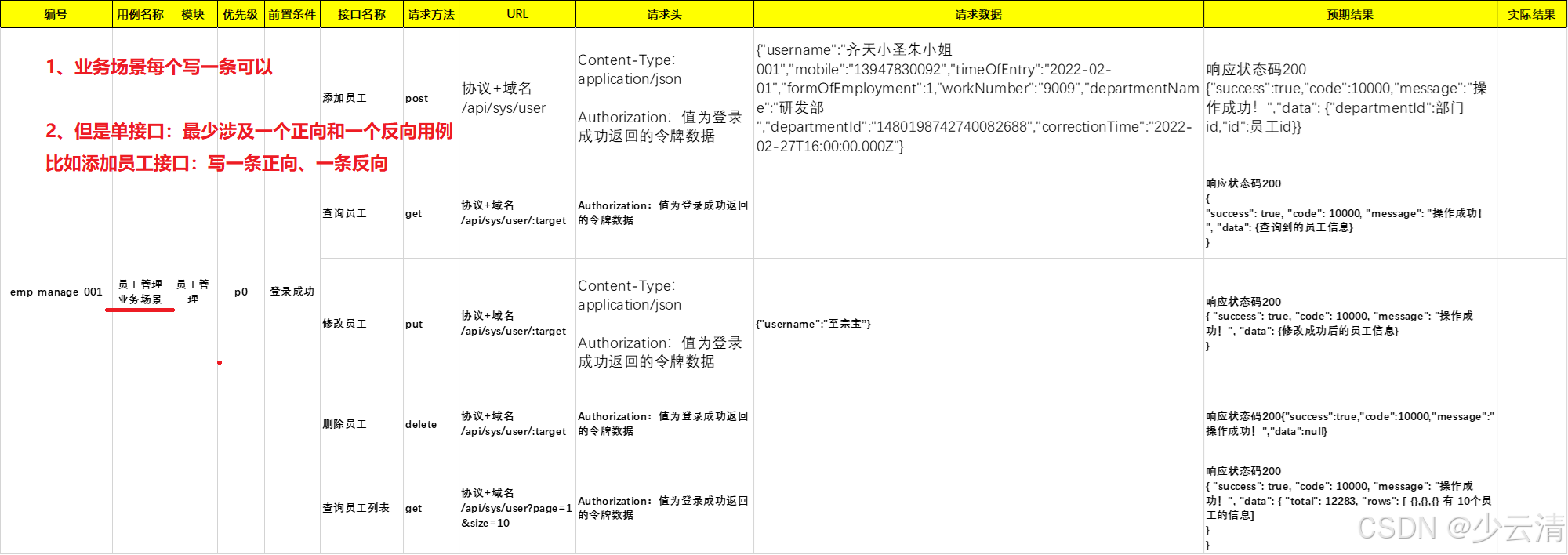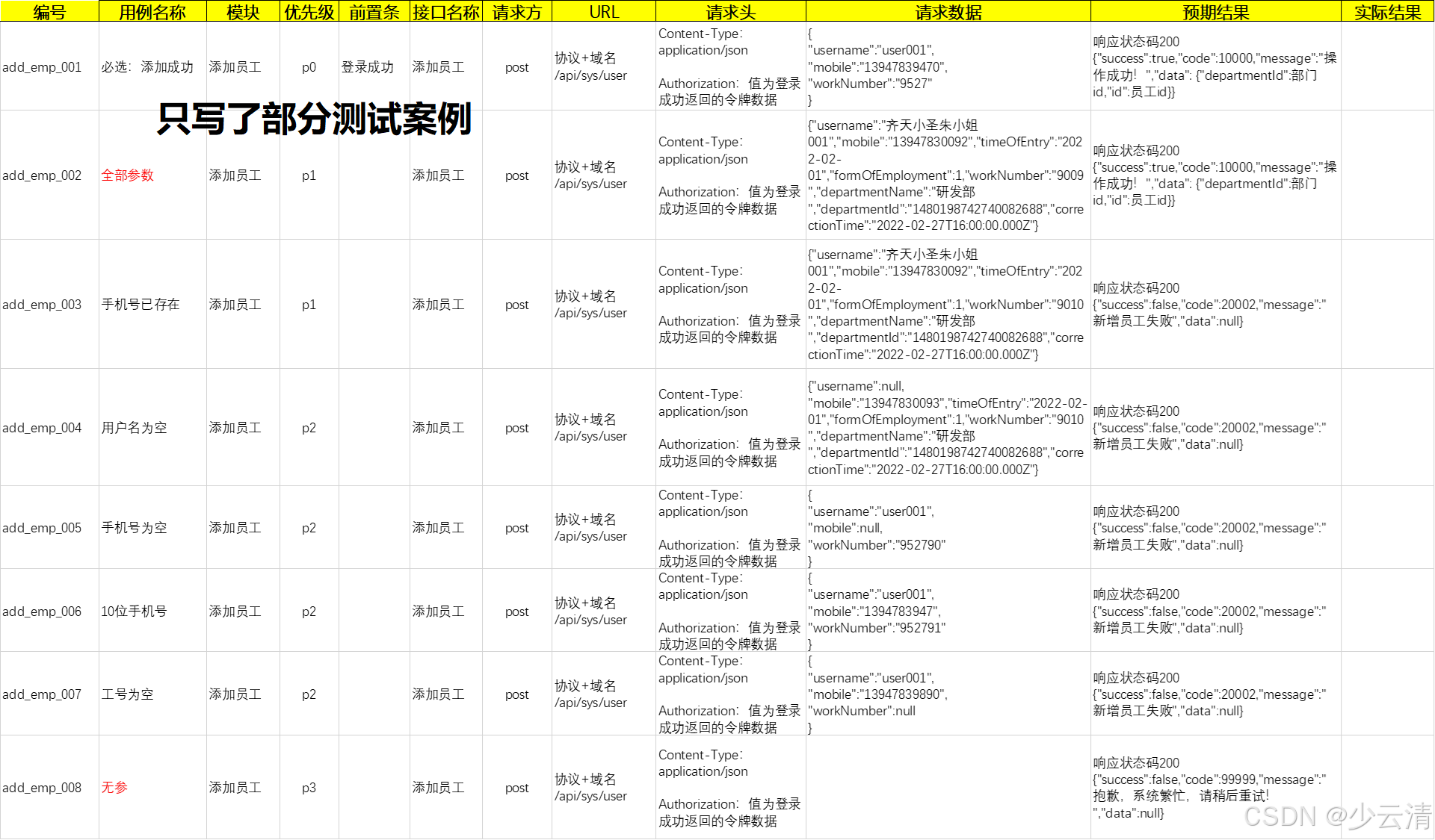 - 编号、用例名称(标题)、模块、优先级、预置条件、接口名称、请求方法、URL、请求头、请求体(请求数据)、预期结果