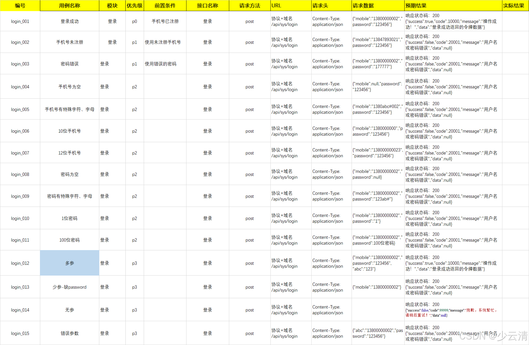 | 编号 | 用例名称 | 模块 | 优先级 | 预置条件 | 接口名称 | 请求方法 | URL | 请求头 | 请求体(请求数据) | 预期结果 |