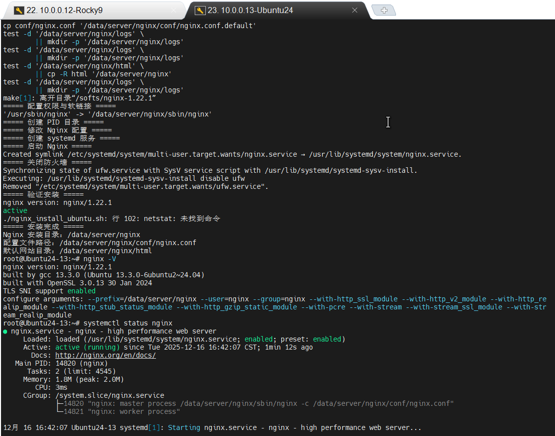命令解释:执行脚本,自动完成 Nginx 源码编译安装的全部步骤。