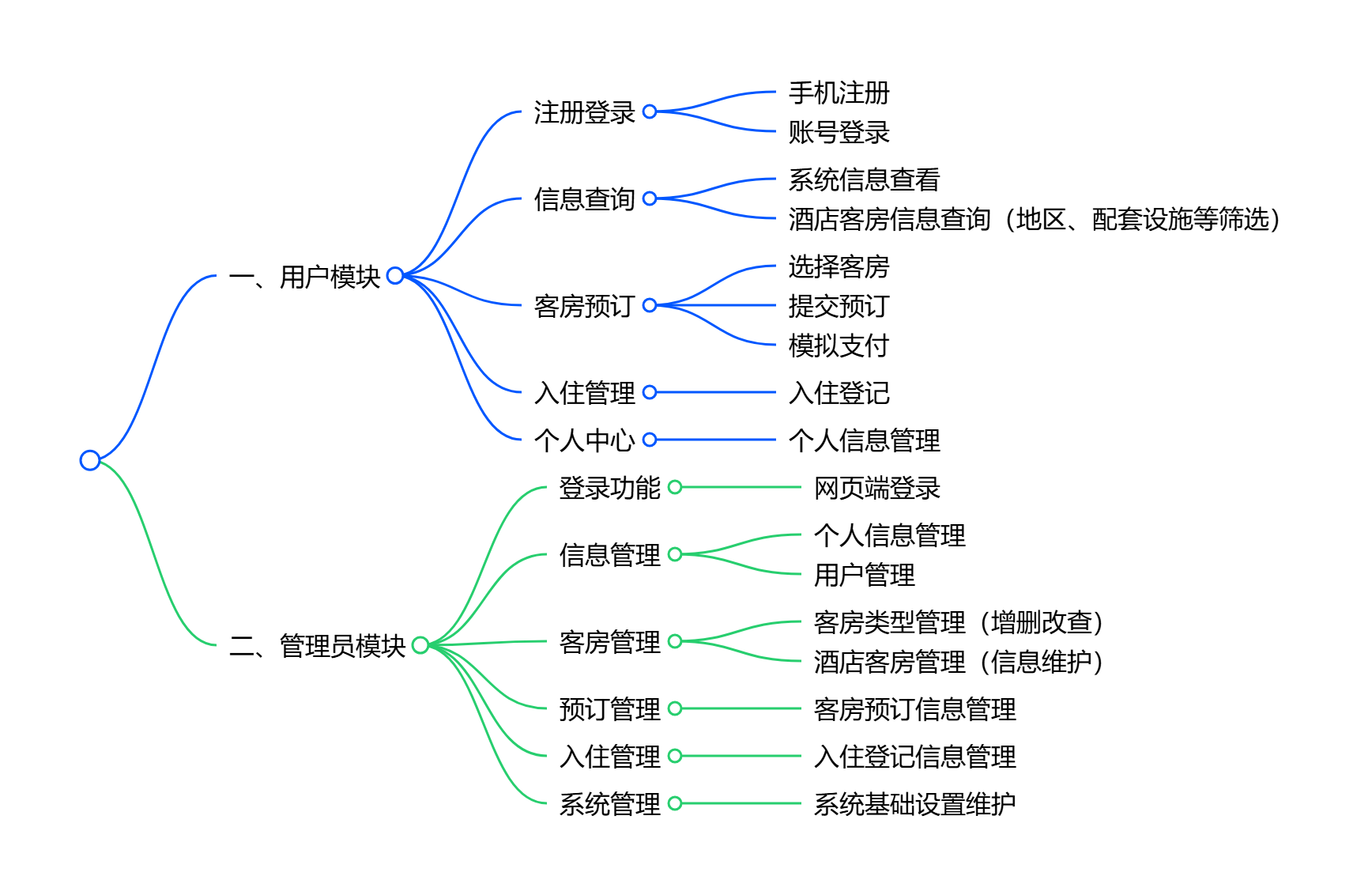 - 用户端可注册登录、查询酒店客房信息、预订客房、模拟支付、办理入住登记及管理个人信息;